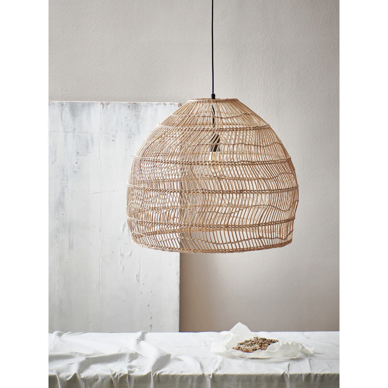 Hand woven wicker hanging lamp.