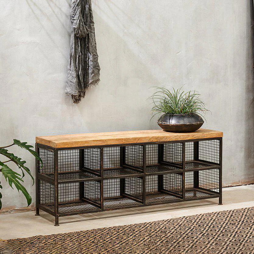 This industrial mesh storage bench has eight useful compartments, ideal for keeping shoes and other items tidied away. The practical bench has a chunky natural wood bench seat.